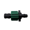 Rotate the locking nut backwards to expose the tape barb. Slide the drip tape over the barb until it hits the stop. Twist the locking nut forward (clockwise) to lock the tape in place.